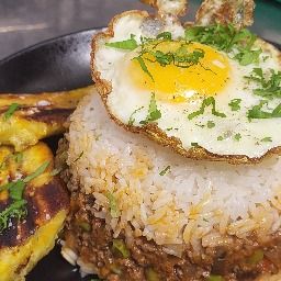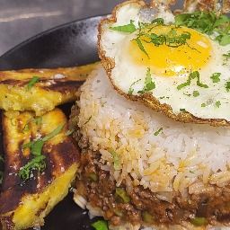 Plat : Arroz tapado (riz fourré à la viande de boeuf sauce aji panca et ses petits légumes, servi avec banane plantin).